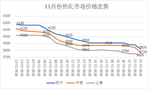 随着冬季来临,北方市场需求进入淡季,同时在环保限产力度不及预期的情况下,产量处于回升状态,且首钢、本钢超10万吨的出口订单转至国内,因此,其资源在本地难以消化的情况下,南下流出势在必行。据了解,后期有20万吨本钢、通钢资源陆续发往华东地区,杭州、宁波、上海等均有大批资源流入。目前,浙江地区本钢资源超2万吨,主要集中在宁波市场,且价格较低,对本地资源价格有所压制。近日,本钢资源市场报价一路走低,导致宁钢价格跌速加快,23日再度震荡下跌70元/吨,已跌破3800元/吨,按照11月结算价格与补差情况来看,已处于严重亏损状态。