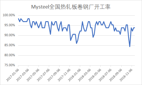 从数据上看,2018年宁波热轧库存在前3季度相对低位,进入4季度以来,受成交不畅影响,库存便在高位震荡。据Mysteel调研数据显示,当前宁波热轧库存在11万吨左右,同比有所下降,主要原因在于到货缓慢且分散。就当前市场情况来看,由于市场需求难见持续性好转,价格又处于下跌通道,导致贸易商囤货意愿极弱,因而只能加速出货,杜绝累库以规避风险。从开工率数据来看,在10月底经历一波集中检修之后,热轧开工率近期保持在92%-94%之间,当前产量逐渐回升至高点。华东地区12月7日-12月14日宁钢计划对1780mm热轧产线进行为期一周的检修,预计影响产量10万吨左右,但从全国数据来看,暂时没有集中检修计划,本次检修对大环境没有实质性的影响。