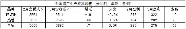 Mysteel调查的全国91家高炉钢厂,3月底螺纹钢平均含税成本为3541元/吨,月环比减少10元/吨,降幅0.3%,盈利322元/吨,增加49元/吨;热卷为3595元/吨,环比减少44元/吨,降幅1.2%,盈利202元/吨,增加98元/吨;中厚板为3682元/吨,环比增加17元/吨,增幅0.5%,盈利为275元/吨,增加49元/吨。