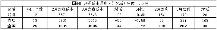 热卷方面,3月底对全国25家热轧板卷生产企业调研了解到,热卷平均成本为3595元/吨,环比减少44元/吨,降幅1.2%;分区域来看,沿海地区12家钢厂热卷平均成本为3543元/吨,环比减少28元/吨,降幅0.8%;内陆地区13家钢厂热卷平均成本为3645元/吨,环比减少56元/吨,降幅1.5%;盈利空间方面,3月份热卷生产企业盈利空间在202元/吨,环比增加98元/吨。