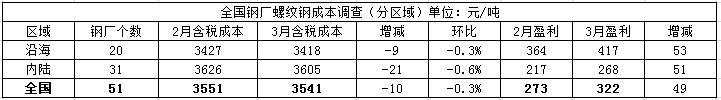 螺纹钢方面,3月底对全国51家螺纹钢生产企业调研了解到,螺纹钢平均成本为3541元/吨,环比减少10元/吨,降幅0.3%;分区域来看,沿海地区20家钢厂螺纹钢平均成本为3418元/吨,环比减少9元/吨,降幅0.3%;内陆地区31家钢厂螺纹钢平均成本为3605元/吨,环比减少21元/吨,降幅0.6%;盈利空间方面,3月份螺纹钢生产企业盈利空间在322元/吨,环比增加49元/吨。