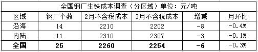 (2)、3月底对全国部分高炉生产企业的调研了解,目前铁水不含税成本为2254元/吨,环比减少6元/吨,降幅0.3%。