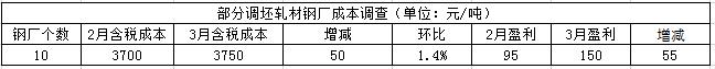 (3)、3月底对全国主要调坯轧材企业生产企业的调研了解,目前钢厂螺纹钢含税轧制成本为3750元/吨,环比增加50元/吨,增幅1.4%;盈利150元/吨,环比增加55元/吨。
