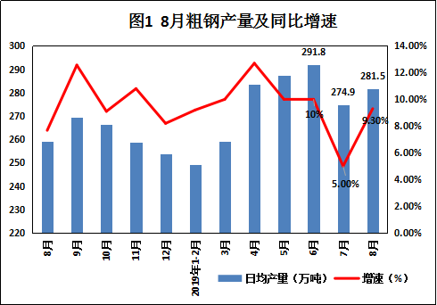 2019年全球经济增速加速下滑,国际金融环境愈加复杂,经济衰退信号频发。从9月16日国家统计局公布的8月份宏观产经数据来看,在宏观经济下行的背景下,我国国民经济仍然延续了总体平稳、稳中有进的发展态势。其中,钢铁行业相关的数据表现为: