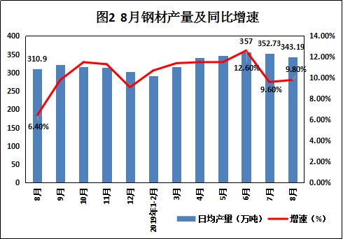 8月份钢材日均产量总量343.19万吨,同比增长9.8%,较七月份增长0.2个百分点;1-8月钢材总产量为69776万吨,同比增长11.0%。