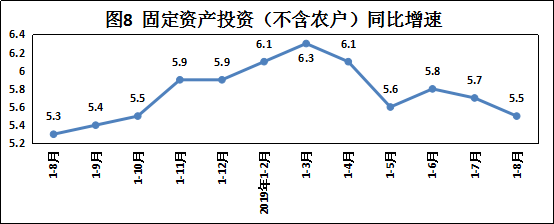 1—8月份,全国固定资产投资(不含农户)400628亿元,同比增长5.5%,增速比1—7月份回落0.2个百分点,投资增速保持平稳,短板领域投资改善。其中,工业投资同比增长3.3%,增速比1—7月份回落0.5个百分点;制造业投资增长2.6%,增速回落0.7个百分点;基础设施投资(不含电力、热力、燃气及水生产和供应业)同比增长4.2%,增速比1—7月份加快0.4个百分点。