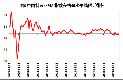 今年我国制造业发展一直面临着较大压力,由图6可知,自2018年底以来中国制造业采购经理指数始终在枯盈水平线附近徘徊,8月份,中国制造业PMI为49.5%,比上月小幅回落0.2个百分点。