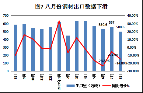 据海关数据显示,8月份我国钢材出口数据出现下滑,钢材出口总量为500.6万吨,同比下降14.8%,较7月回落9.4个百分点;1-8月为4497.4万吨,与去年同期相比减少4.4%。