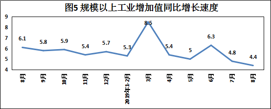 8月份,我国规模以上工业增加值同比实际增长4.4%,比7月份回落0.4个百分点。1—8月份,规模以上工业增加值同比增长5.6%。其中,黑色金属冶炼和压延加工业增长10.4%,有色金属冶炼和压延加工业增长8.5%,通用设备制造业与上年同月持平,专用设备制造业增长3.3%,汽车制造业增长4.3%,铁路、船舶、航空航天和其他运输设备制造业增长7.8%,电气机械和器材制造业增长10.0%。